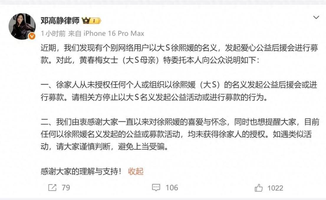 有人假借大 S 名义进行非法募捐、成立所谓 “后援会” 敛财,徐家人从未授权任何个人或组织以徐熙媛(大 S)的名义开展公益、募款等活动,提醒公众提高警惕,避免上当受骗。